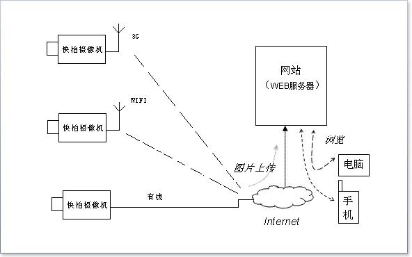 如图所示,快拍系统主要由快拍摄像机、网站两部分组成,快拍摄像机自动拍照,通过ADSL/3G/专线或其它联网方式, 自动把拍摄到的照片上传到互联网网站,网站用户就可以通过电脑或手机浏览上传的图片,获取所需要的信息。